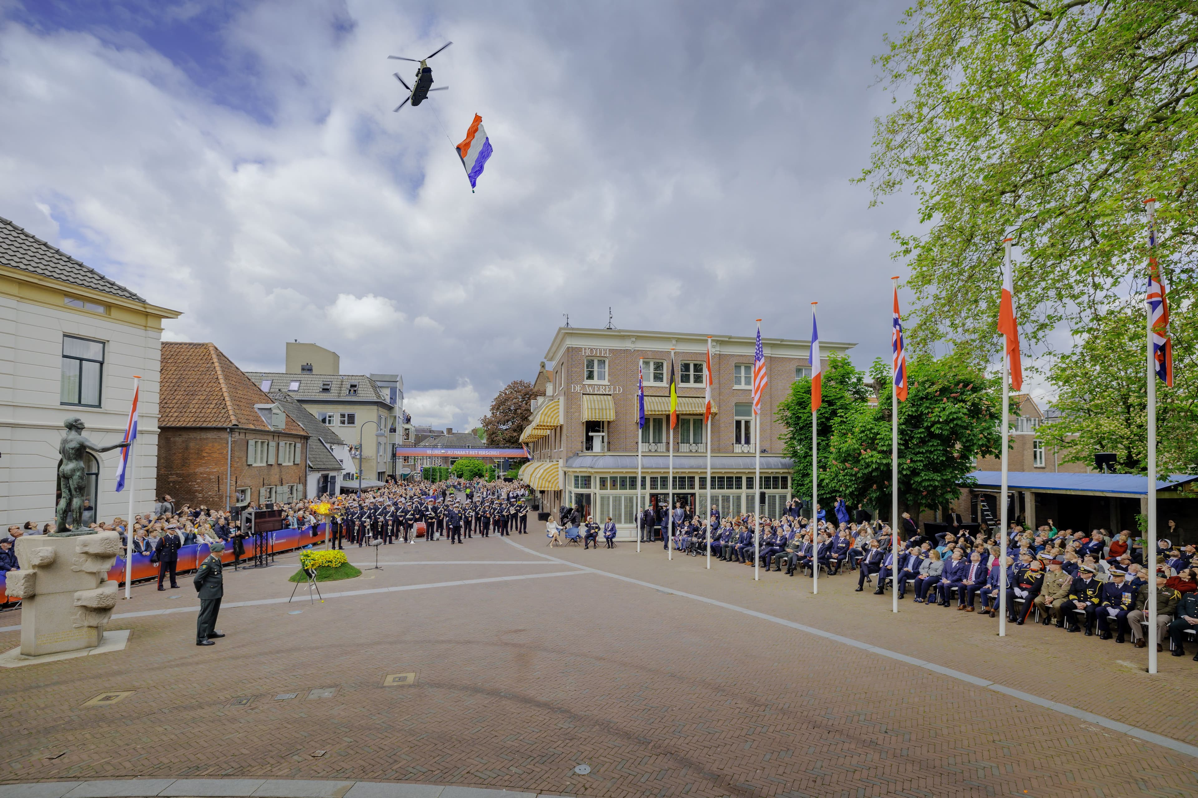 Een korte inhoudelijke inleiding door de presentator van Omroep Gelderland, een speech van de voorzitter van Wageningen45, de kranslegging door de Burgemeester van Wageningen en voorzitter van Wageningen45, the Last Post, een minuut stilte, het Wilhelmus tezamen met het hijsen van de Nederlandse vlag , een speech van de minister van Defensie , de vlaggenceremonie van de acht betrokken geallieerde landen, met het militair orkest: Orkest Koninklijke Marechaussee. Deze vlaggen worden gehesen door desbetreffende Militaire Attachés en begeleid door acht kinderen van scouting die Wiltgraeff, een kort gesprek tussen de voorzitter van Wageningen45 en de presentator van Omroep Gelderland en tot slot de fly by van een chinook met een Nederlandse vlag eronder van de Koninklijke Luchtmacht. Aansluitend start het Vrijheidsdefilé. Uitgezonden door onze mediapartners: Omroep Gelderland en de NOS.