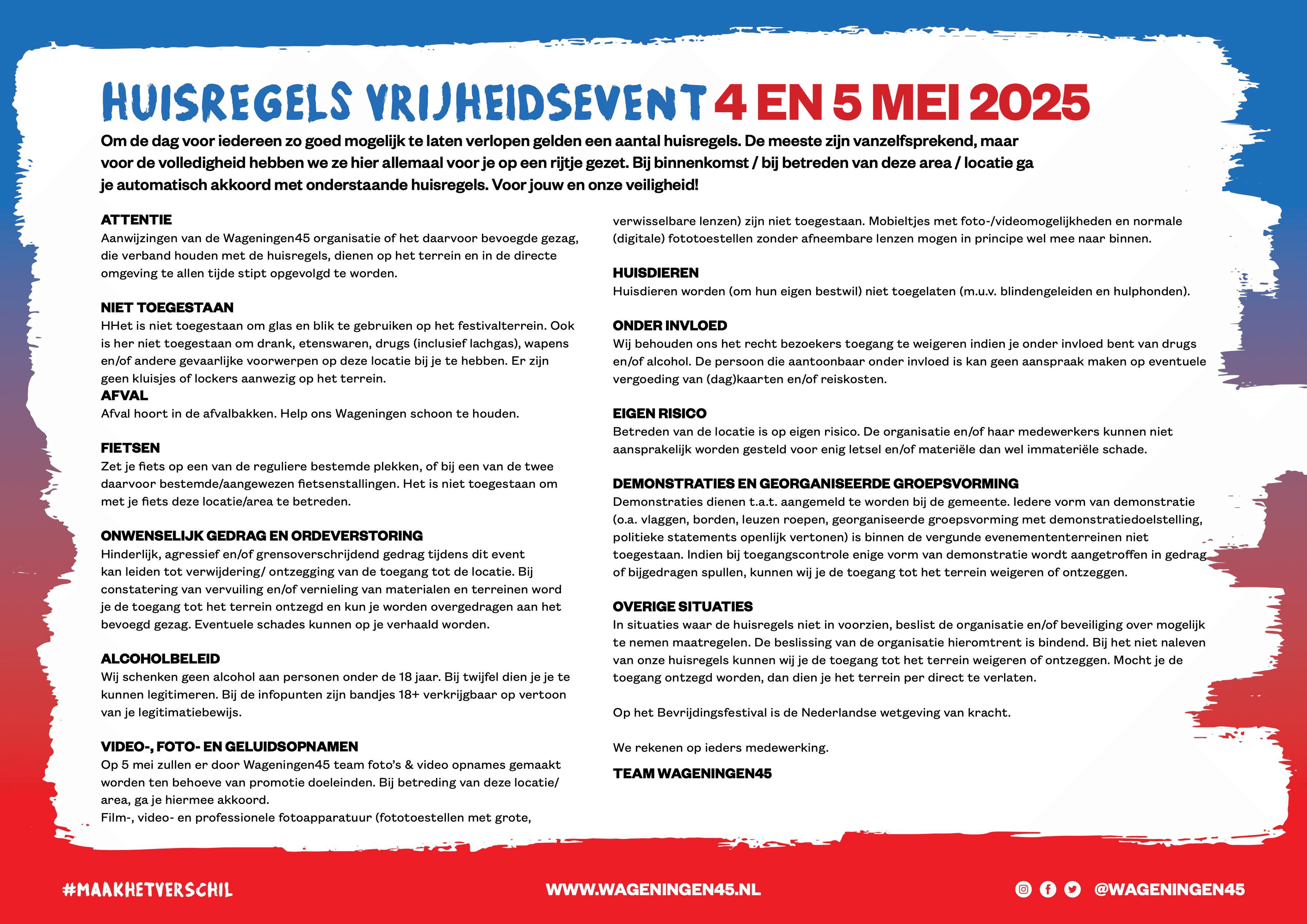 De meeste huisregels spreken voor zich, maar neem ze even door zodat we samen kunnen genieten van een veilig en vrolijk Bevrijdingsfestival!