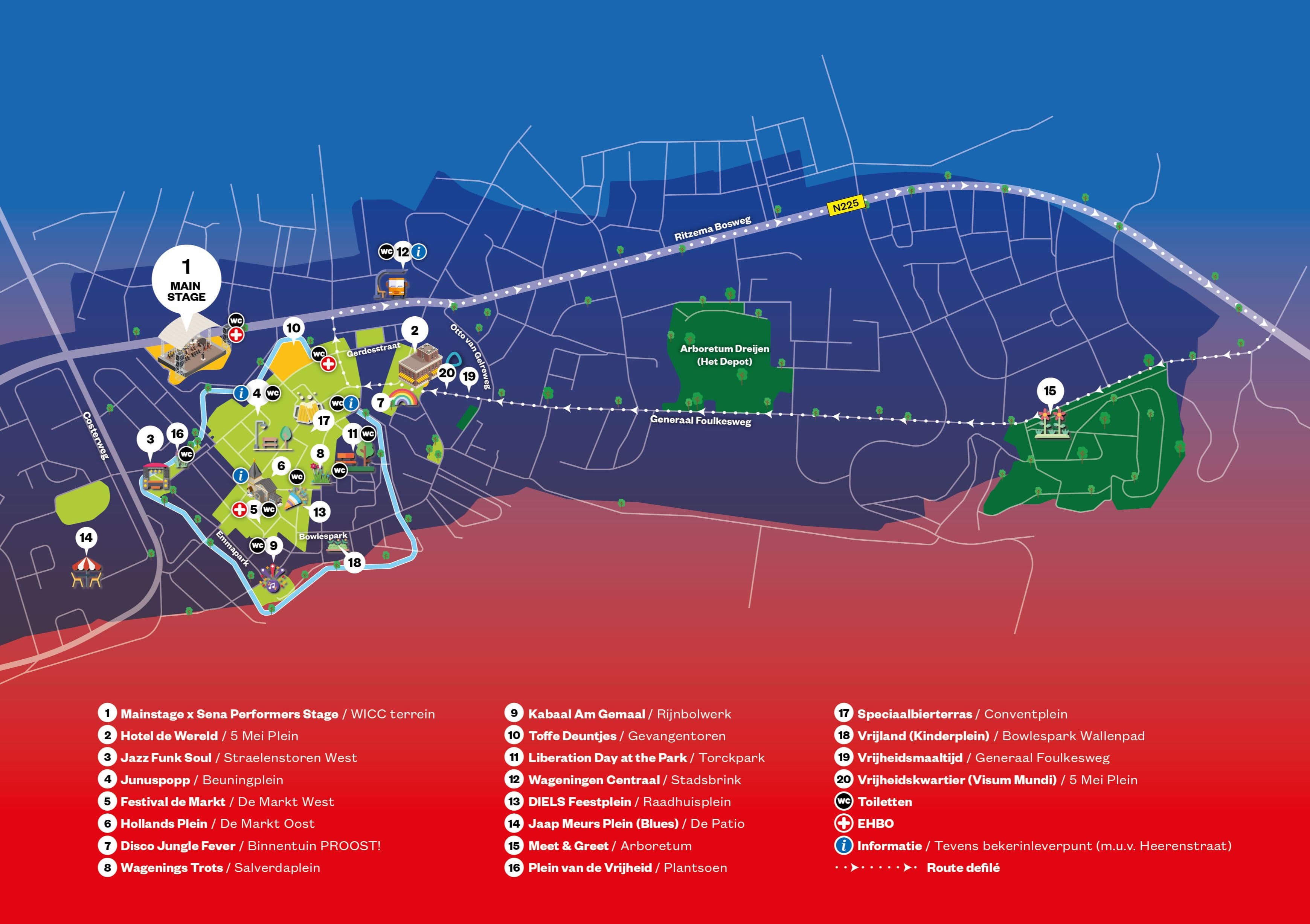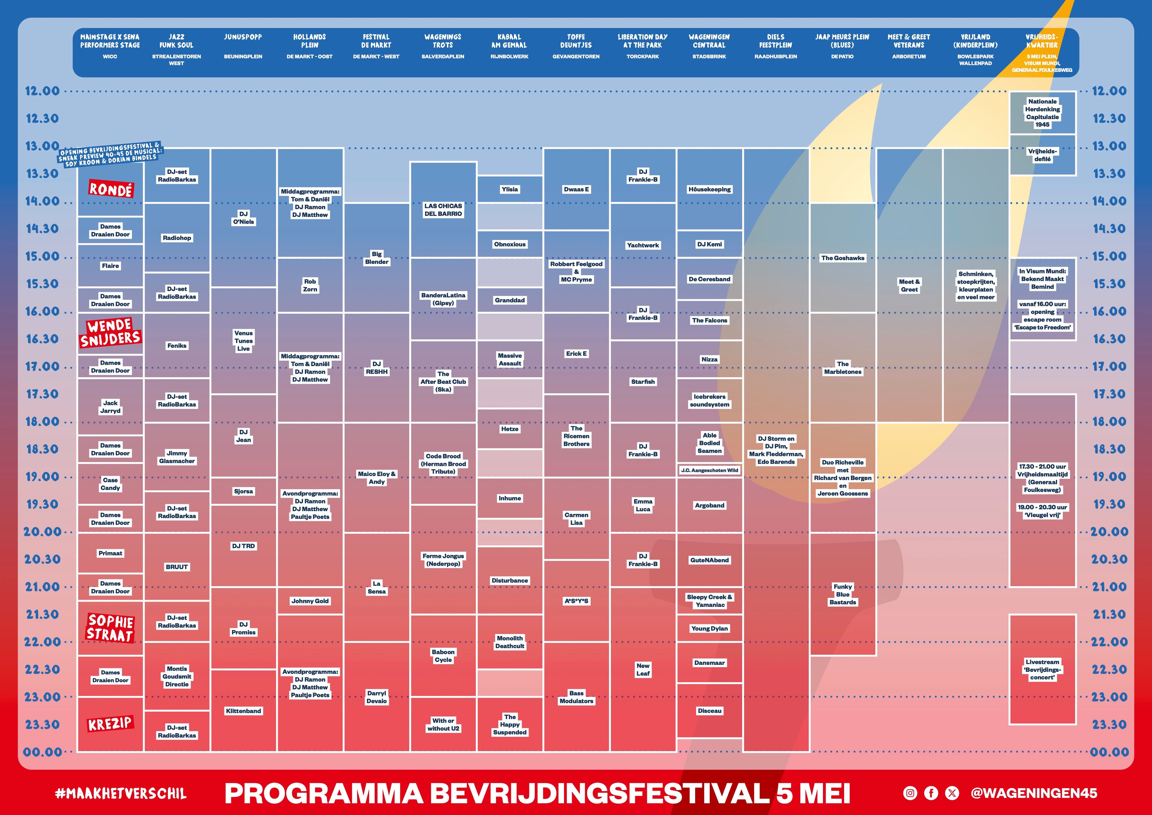 Op het blokkenschema vind je alle optredens tijdens het Bevrijdingsfestival, verspreid over 11 podia door heel Wageningen!