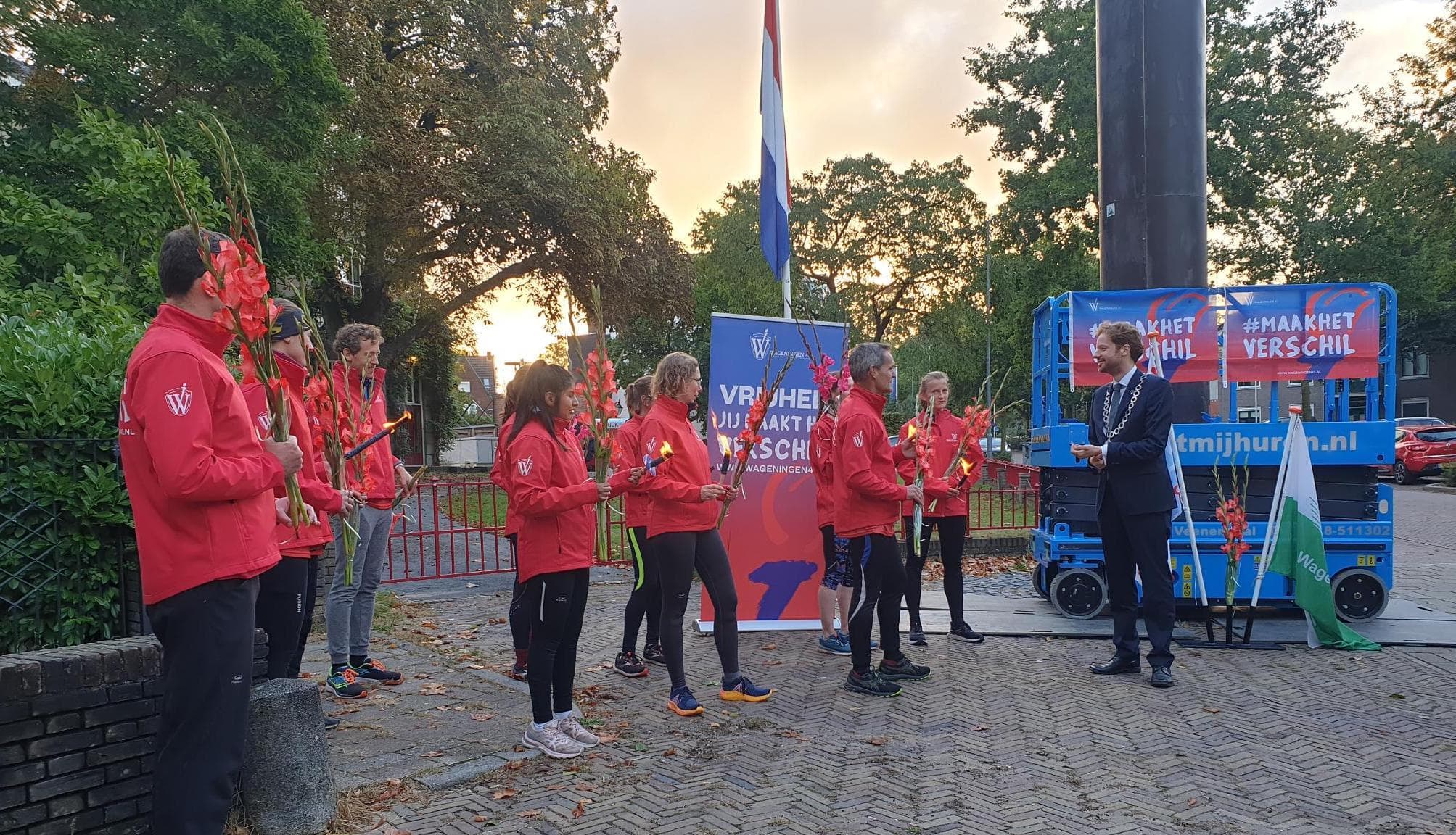 Burgemeester Floor Vermeulen nam vervolgens samen met een loper van atletiekvereniging Pallas’67 het vuur over. In de nacht van 18 op 19 september hebben de lopers van Pallas ’67 het vuur naar Wageningen gebracht waar het in de ochtend is overhandigd aan de kinderburgemeester (Kathy), die samen met burgemeester Vermeulen, klaar stond om het vuur in ontvangst te nemen. Zo werd het Bevrijdingsvuur ververst vlak bij het Nationaal Bevrijdingsmonument op het 5 Mei Plein. Een traditie die jaarlijks de start van een nieuw jaar van herdenken en koesteren markeert.
